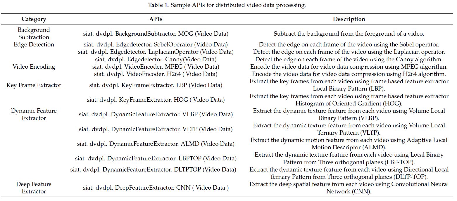 Here, we integrated the popular image and video processing library JavaCV with Spark to support basic video processing operations, for example, frame extraction, frame conversion (RGB to gray-scale), and many more. On top of that, we built our distributed video processing and mining APIs, which plays an important role to provide any higher level services. Some sample APIs for distributed video processing are presented in Table 1. Our wrapper APIs permit us to achieve most video processing operations in parallel in a distributed environment, which reduces the processing time dramatically. Similar to our previous work, in this work, we have implemented several video processing algorithms on top of Spark that includes edge detection, video encoding, background subtraction, key-frame extraction and dynamic feature extraction. For distributed dynamic feature extraction, we have built APIs for Volume Local Binary Pattern (VLBP), Volume Local Ternary Pattern (VLTP), Local Binary Pattern for three orthogonal planes (LBP-TOP) and Directional Local Ternary Pattern for three orthogonal planes (DLTP-TOP). These dynamic feature extraction algorithms form a circularly symmetric neighbor set. For edge detection, we have implemented distributed Sobel operator, distributed Laplacian operator and distributed Canny operator. Furthermore, we have developed distributed video encoding using MPEG and H264. We also deployed distributed key frame extractor using Local Binary Pattern (LBP) and Histogram of Oriented Gradient (HOG) based features. The main advantages of these APIs are developer can produce any higher-level services using these APIs without considering the insights of these APIs, which makes the developer's life easy and simple. However, the developer can also build their own APIs and can integrate with the system.