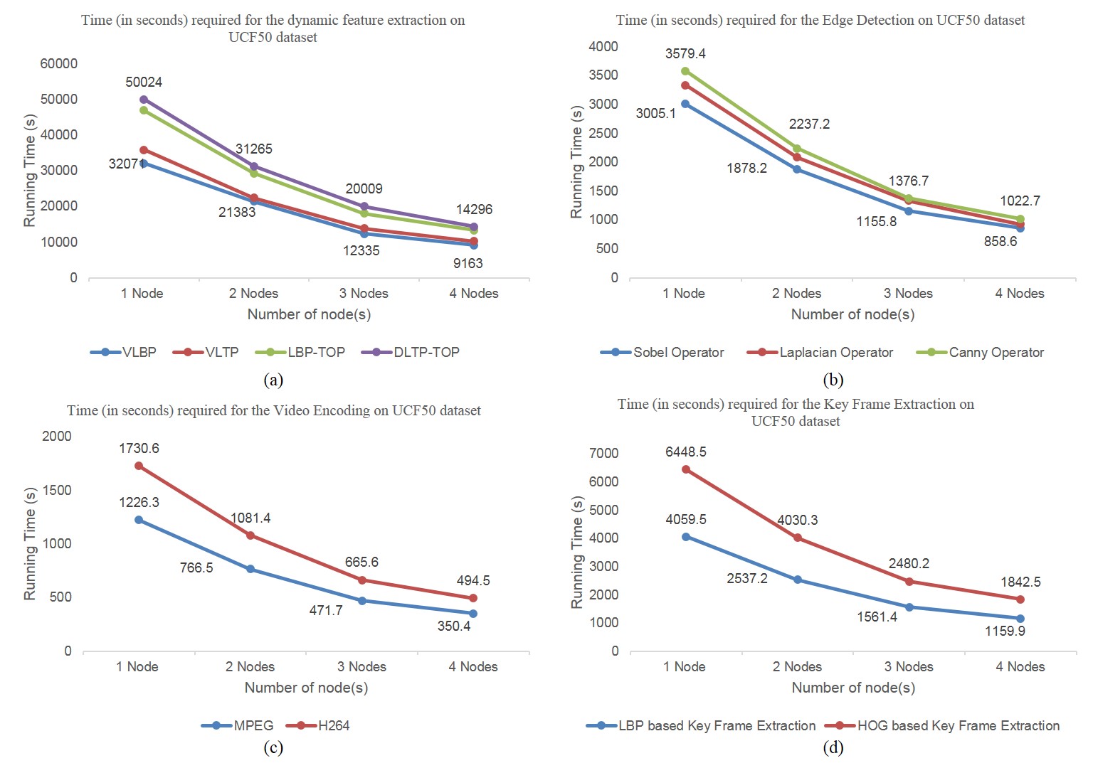 FlowScalability of low-level APIs for distributed video processing (a) Time (in seconds) required for the dynamic feature extraction on UCF50 dataset, (b) Time (in seconds) required for edge detection on UCF50 dataset, (c) Time (in seconds) required for video encoding on UCF50 dataset and (d) Time (in seconds) required for key frame extraction on UCF50 dataset.